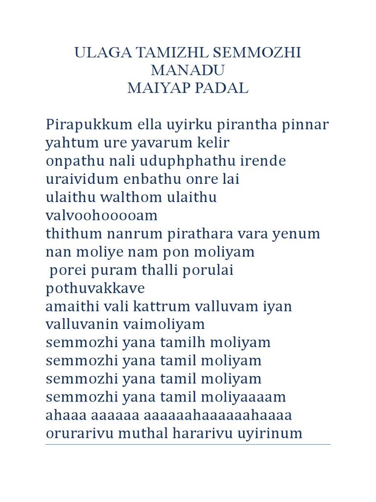 Semmozhiyana Tamil Mozhi Song Lyrics Download / Pirapokkum ella uyirkkum pirandha pinnar a.r.